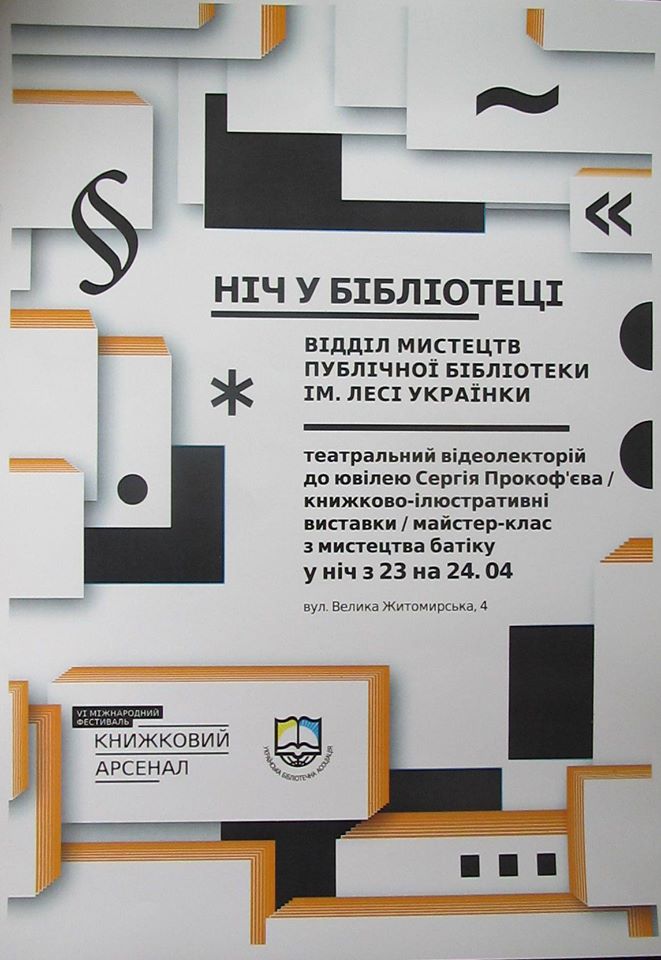 Запрошуємо на нічну програму відділу мистецтв, що проводиться в рамках програми “Книжкового арсеналу-2016”.17.00–20.00 Програма від наших гостей – студентів акторського факультету Національного університету театру кіно і телебачення імені І. Карпенка-Карого з курсу народного артиста України Миколи Рушковського (виставковий зал).