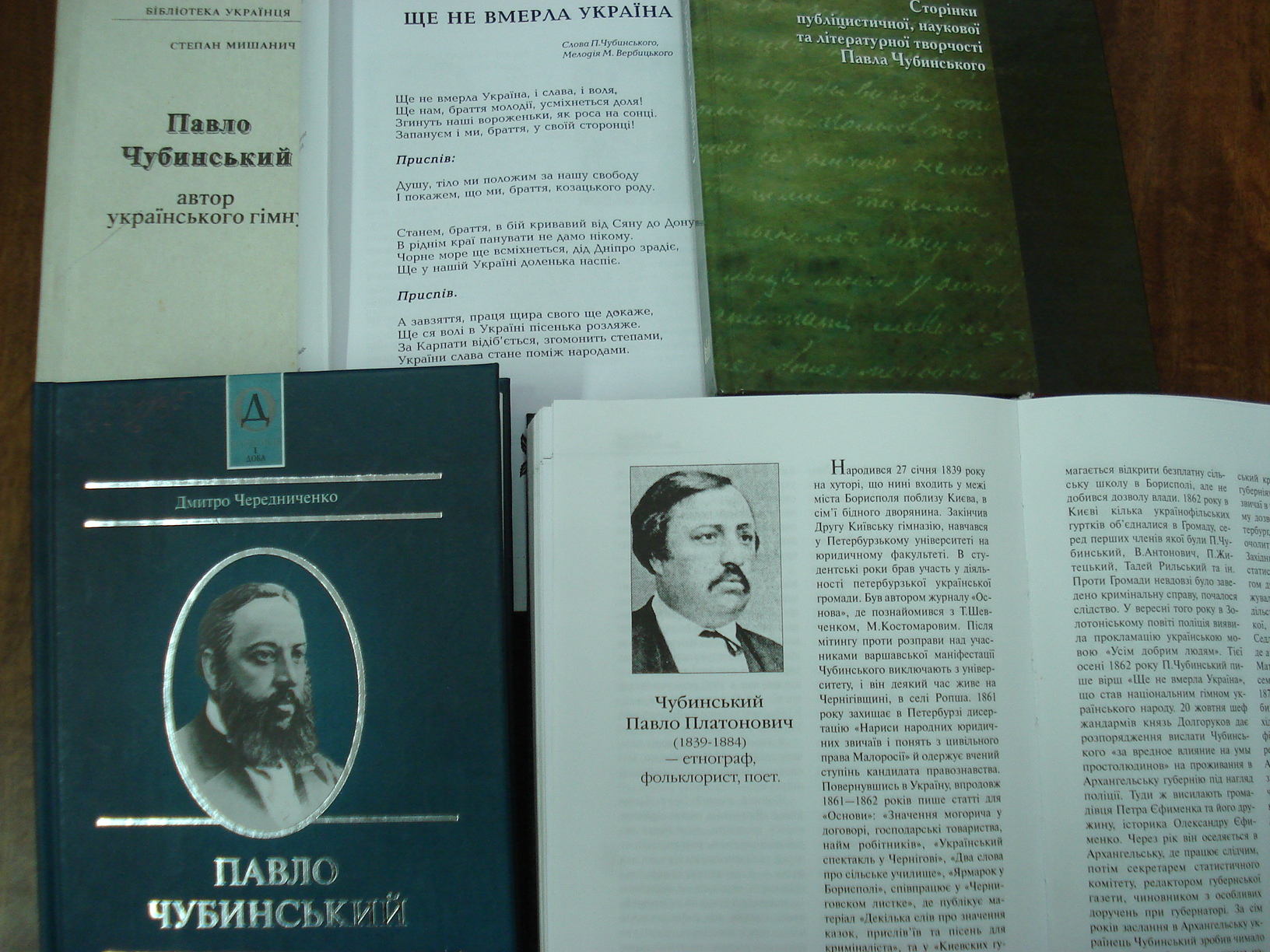 В читальній залі до 175-річчя від дня народження та 130-річчя від дня смерті Павла Платоновича Чубинського, одного з найбільших титанів «другого українського Відродження», етнографа і фольклориста, поета і журналіста, громадського діяча, ученого, що змінив уявлення світу про українців, а українців – про себе самих проведено перегляд літератури про життя і творчий шлях автора вірша, якому судилося стати Державним Гімном України.
