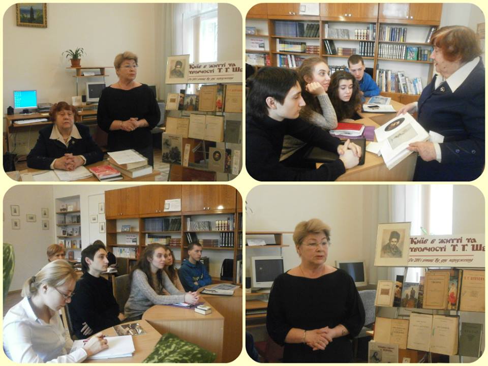 «Тарас Шевченко і сучасність», такою була тема зустрічі користувачів, студентів 4 курсу історичного факультету Національного університету ім. Тараса Шевченка у відділі краєзнавчої літератури та бібліографії з відомим мовознавцем, доктором філологічних наук, професором, академіком Міжнародної академії наук вищої школи Януш Ядвігою Вацлавівною, присвячена 200 – річчю від дня народження Тараса Шевченка. За активної участі аудиторії, в атмосфері невимушеного спілкування Ядвіга Вацлавівна розкривала поняття: Тарас Шевченко і культура; Тарас Шевченко як особистість; Тарас Шевченко – художник; Тарас Шевченко – поет. Присутні на зустрічі ознайомилися з виставкою цінних, раритетних видань творів Т. Г. Шевченка кінця ХІХ початку ХХ ст., що зберігаються у відділі та з натхненням читали улюблені вірші поета.