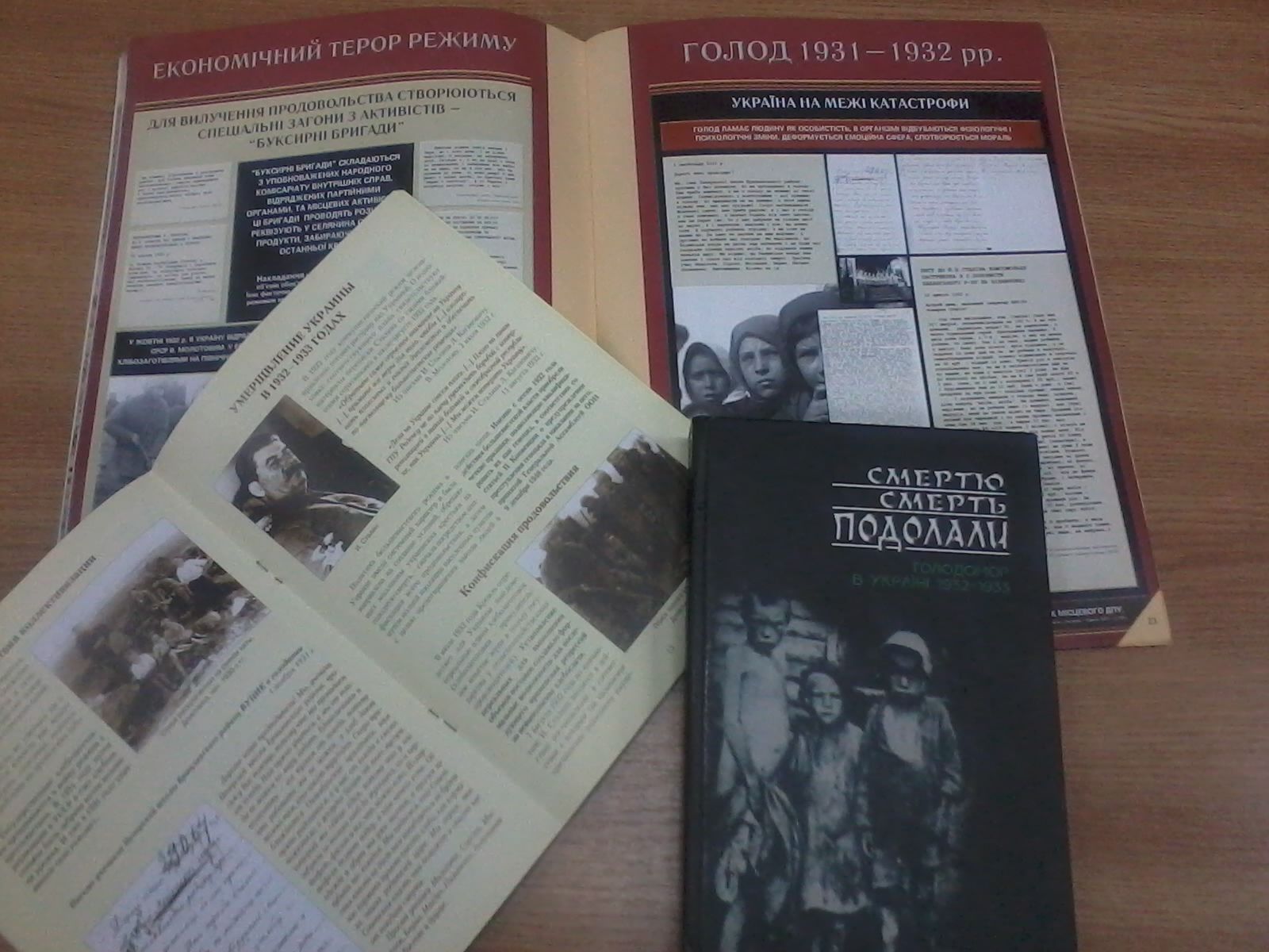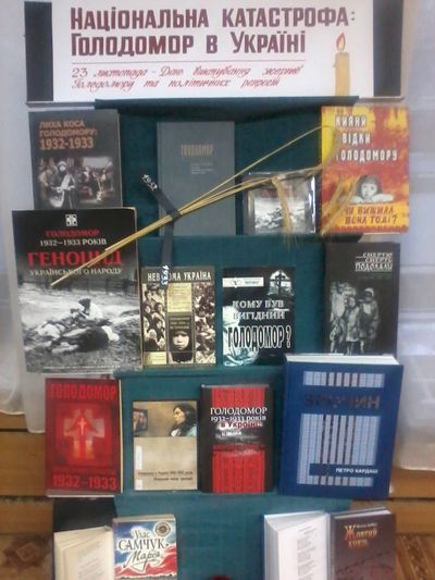 До Дня пам’яті жертв голодомору та політичних репресій у читальному залі відкрито виставку-реквієм «Національна катастрофа: Голодомор в Україні».Страшна правда постає зі сторінок документів, спогадів, художніх творів. Мільйони людей, які загинули у 1932-33 роках голодною смертю, не можуть безслідно розчинися у часі і просторі. Про них пам’ятатимемо ми, їх діти та онуки. Говорячи словами О.Міщенка «Мертвим нікому довіритися, крім живих, – і нам треба так жити тепер, щоб смерть наших людей була виправдана щасливою і вільною долею нашого народу». 80 років тому наш народ пережив катастрофу, яка могла зупинити життя всієї нації. Голодомор приніс не лише страждання і смерть. Він посіяв страх серед людей. Тільки правда про геноцид українського народу і пам’ять про усіх полеглих здатна звільнити нас від мороку минулого. Пам’ять – нескінченна книга, в якій записано все: і життя людини, і життя країни. Багато сторінок написано криваво-чорним кольором. Масове голодування почалося в грудні 1931 року і тривало до вересня 1933.