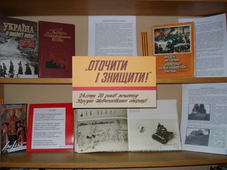 Канни на Дніпрі, Український Сталінград, Корсунь-Шевченківське побоїще – як тільки не називали перемогу радянських військ під Корсунем. Багато часу минуло з тієї похмурої та мінливої зими із снігопадами та відлигами, коли вдалося остаточно та назавжди вибити німців зі славетних для історії українського народу місць. Ця історична перемога в Корсунь-Шевченківській битві дісталася Червоній армії коштом великих втрат. Загинуло 770 тисяч людей, переважно українців. Тисячі солдатів і офіцерів були нагороджені орденами і медалями. Близько ста воїнів удостоєно звання Героя Радянського Союзу. З нагоди 70-річчя початку Корсунь-Шевченківської операції у читальній залі відкрито літературну полицю, де представлено книги, фотографії та інші документи, що розповідають про ті події.