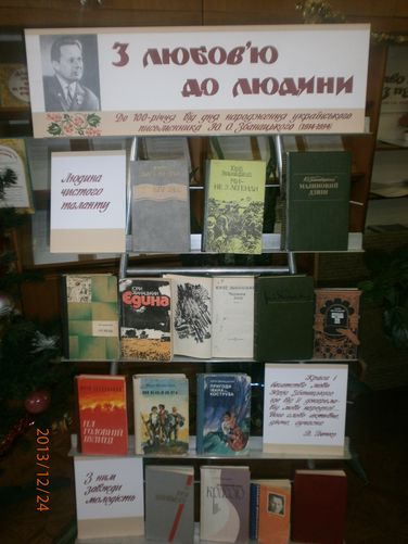 1 січня 2014 р. виповнюється 100 років від дня народження українського письменника Юрія Оліферовича Збанацького. До цієї дати у відділі абонемента відкрито книжкову виставку «З любов’ю до людини». «Юрій Збанацький одразу, без особливого розгону, прийшов у літературу як самобутній талант зі своїм оригінальним художнім світобаченням, що йде від мудрої щедротності народної душі, зі своєю манерою письма, що відображає народну, щиросердну, філософськи заглиблену, епічну повістувальність»