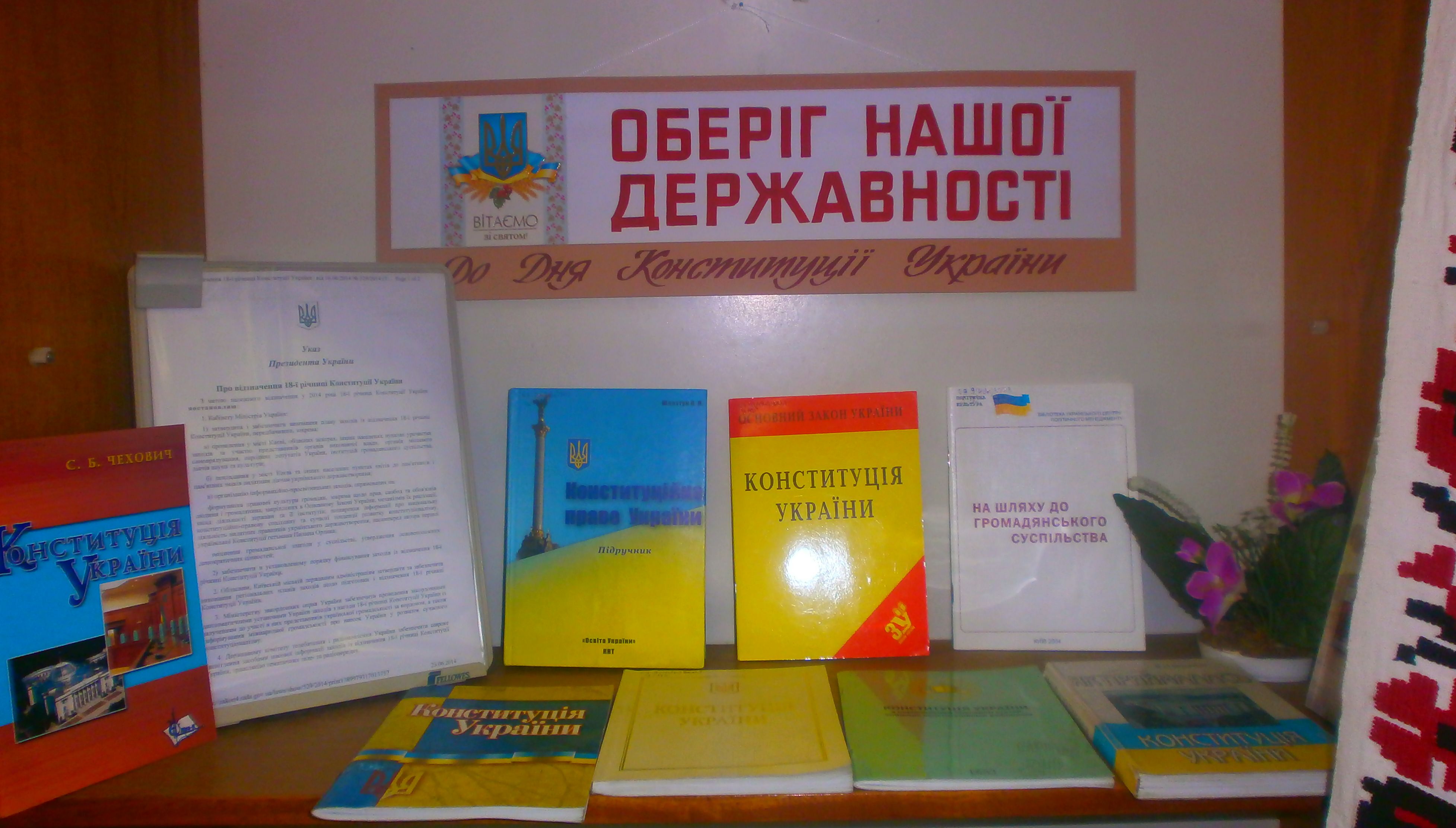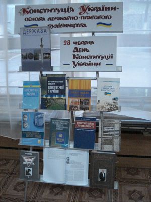 До Дня Конституції, одного з найважливіших державних свят, в читальній залі відкрито книжково-ілюстративну виставку «Конституція України – основа державно-правового будівництва». Користувачі бібліотеки мають змогу ознайомитися з Конституцією України, нормативно-правовими актами, які її доповнюють, сучасними публікаціями науковців у сфері конституціоналізму, юридичною літературою, статтями даної тематики з періодичних видань.
