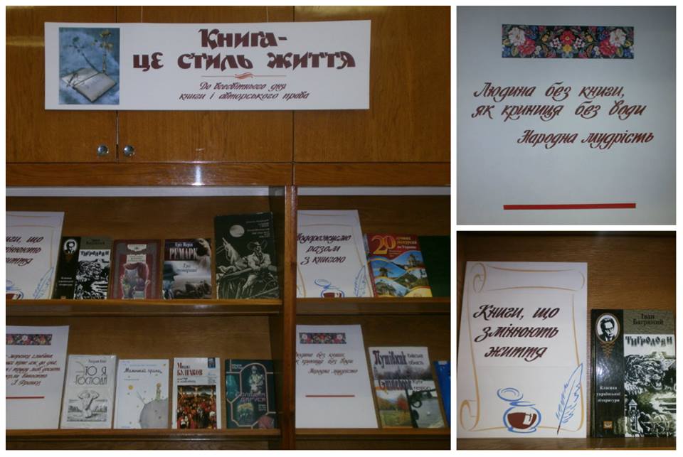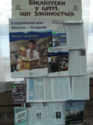До Всеукраїнського дня бібліотек, який відзначається 30 вересня, у читальній залі відкрилася виставка літератури «Бібліотеки у світі, що змінюється», що розповідає про сучасні, нові різноманітні форми роботи, що застосовуються в роботі бібліотек. Якісне надання інформаційних послуг, навчання комп’ютерної грамотності, використання електронних книжок, надання доступу до Інтернет-ресурсів, вихід бібліотек у соціальні мережі, цікаві масові заходи – усе це дає змогу залучати до користування бібліотекою нових відвідувачів, робить її надзвичайно привабливим місцем для роботи, навчання і відпочинку.