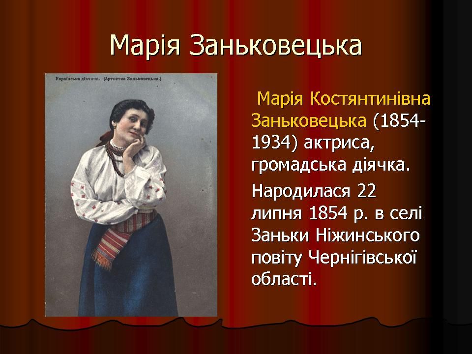 Цими днями минає 160 років з того дня, коли народилася видатна українська театральна актриса Марія Костянтинівна Заньковецька. Життю та творчості корифея української сцени, фундатора першого українського стаціонарного театру в Києві (1906 р.) та Народного театру (1918р., нині Український драматичний театр ім. М. Заньковецької у Львові) у відділі мистецтв присвячено книжково-ілюстративну виставку, що триватиме до 30 серпня 2014 року.