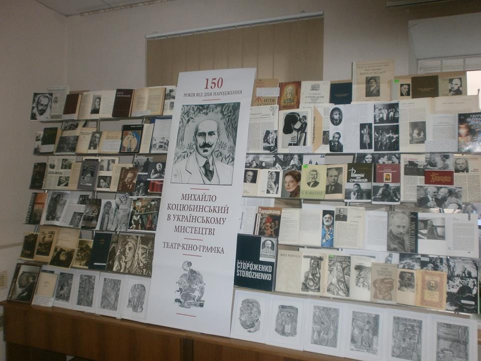До 150-річчя від дня народження видатного українського письменника Михайла Михайловича Коцюбинського у відділі мистецтв відкрито книжково-ілюстративну виставку «М.Коцюбинський в українському мистецтві. Театр. Кіно. Графіка». Представлені документи присвячені театральним виставам за творами письменника: постановка 1925 року Гната Юри у Харкові вистави «Фата моргана», одноактна опера «Втікачі» композитора М. Вериківського та балет Ф. Кирейка «Тіні забутих предків». До творчості М. Коцюбинського зверталися українські кіномитці: М. Терещенко («Навздогін за долею»), М. Донськой («Дорогою ціною»), О. Швачко («Кривавий світанок»), С. Параджанов («Тіні забутих предків») та інші. В оформленні виставки використані графічні роботи М. Жука, Г. Якутовича, В. Василенка, І.Їжакевича, М. Стороженка. До цієї ж дати у відділі абонемента відкрито виставку «Аристократ духу», яка знайомить користувачів бібліотеки зі сторінками біографії та творчістю тонкого, довершеного повістяра й новеліста, першого й найбільшого майстра імпресіоністського письма в українській літературі Михайла Коцюбинського, а у читальній залі експонується виставка «Шлях у вічність: Леся Українка і Михайло Коцюбинський». Представлена література розповідає про подібність і своєрідність творчості двох класиків української літератури.