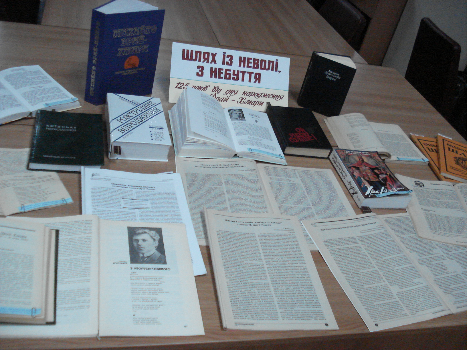 До 125-річчя від дня народження українського поета, літературознавця, перекладача М.О. Драй-Хмари в читальній залі відкрилася виставка літератури «Шлях із неволі, з небуття». Цим шляхом прийшла до нас з 30-х років ХХ століття трагічна поезія митця, що був змушений творити в умовах тоталітарного режиму. Вірші вражають тугою, зневірою і розпачем, але й силою віри у національну революцію. Наукові й літературні праці М. Драй-Хмари, його листи і Щоденник, а також література про важку долю поета представлена на виставці, що триватиме до 15 жовтня.