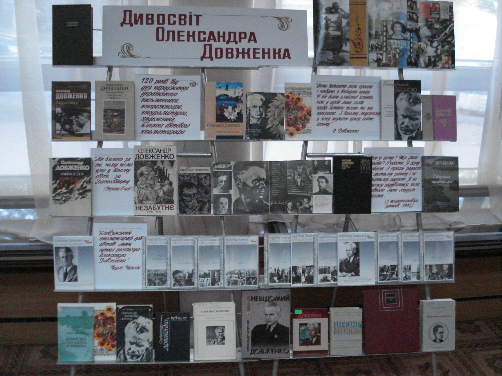 10 вересня виповнюється 120 років від дня народження найвидатнішої постаті української культури ХХ століття – Олександра Довженка. До цієї пам’ятної дати у відділах абонемента, мистецтв та в читальній залі відкрито книжкові виставки, на яких представлена література, що розкриває особливості творчої палітри митця – письменника, кінорежисера, сценариста, художника, педагога, знайомить користувачів з художніми та публіцистичними творами, щоденниками письменника, зібранням фільмів на DVD, створенням його перших фільмів таких як «Ягідка кохання» 1926р. та «Сумка дипкур’єра» 1927р. до останньої кінороботи «Прощавай, Америко!» 1956 року, з життєвим шляхом талановитої, закоханої в життя людини.