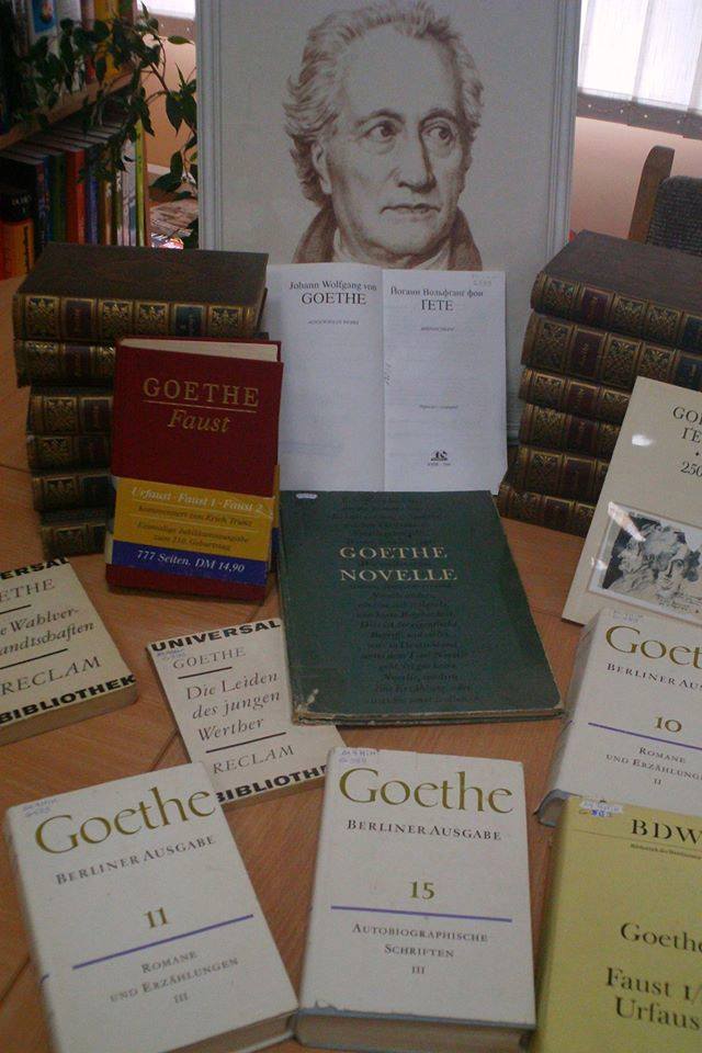 У відділі літератури іноземними мовами відкрито книжкову виставку “Геній – Йоган Вольфганг Гете», що присвячена 265-річчю з дня народження найвизначнішого німецького поета, прозаїка, драматурга, майстра художньої, виразної мови; філософа, натураліста і державного діяча. На виставці представлені твори Гете німецькою мовою. Виставка діятиме до 5 вересня.