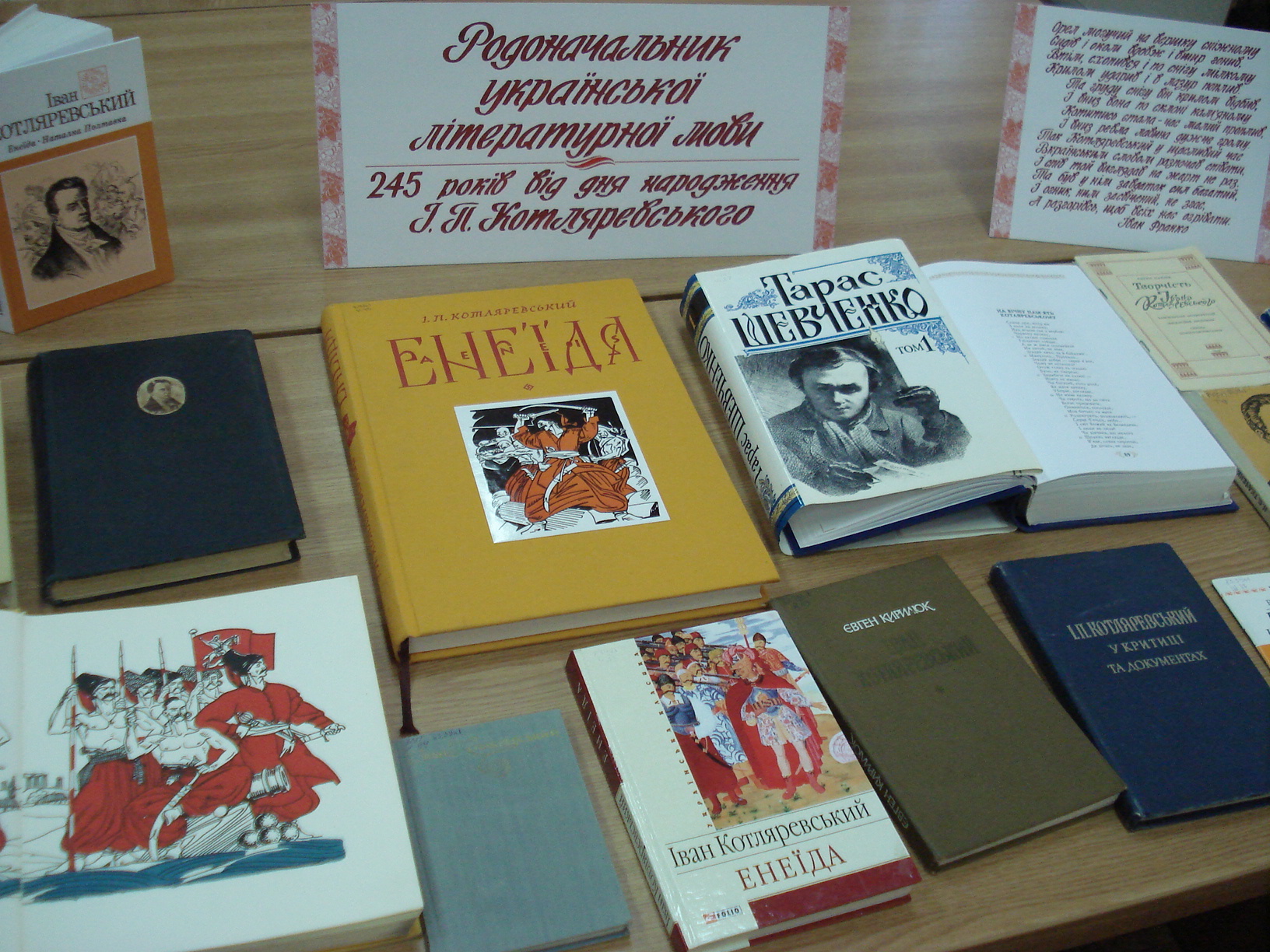 До 245-річчя від дня народження І.П.Котляревського – українського письменника, поета, драматурга, громадського діяча у читальній залі відкрилась книжкова виставка, де представлені твори письменника різних років видання, література про його життя і творчість, спогади сучасників про тогочасний літературний процес. Його поема «Енеїда», п’єси «Наталка Полтавка» та «Москаль-чарівник», написані на основі живого усного мовлення народу, свого часу започаткували новий етап формування літературної мови. М.Коцюбинський, характеризуючи роль Івана Котляревського в розвитку української культури, підкреслив, що «занедбане й закинуте під сільську стріху слово, мов фенікс з попелу, воскресло знову… і голосно залунало по широких світах» з його творів.