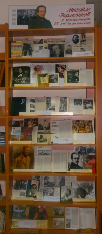 У жовтні 2014 року виповнюється 200 років від дня народження видатного поета і письменника Михайла Лермонтова. З нагоди ювілею у відділі мистецтв відкрито книжково-ілюстративну виставку «Лермонтов у кіномистецтві». До творів поета зверталися режисери від часів появи німого кіно. Так першою екранізацією був фільм «Пісня про купця Калашнікова», створений на студії Ханжонкова у 1908 році. Помітною подією стала екранізація 1941 року С. Герасимовим драми Лермонтова «Маскарад», головну роль в якій талановито виконав актор М.Мордвінов.В 1961 році на екрани вийшов фільм «Герой нашого часу» режисера С. Ростоцького. Відомий режисер А. Ефрос в 1970-х роках створив телевиставу «Сторінки щоденника Печоріна», запросивши зірковий склад акторів: О. Даля, А. Миронова, О.Яковлєву, А.Печернікову та ін. Неодноразово режисери зверталися до біографії Лермонтова. У 1943 році вийшов фільм «Лермонтов» (в гол. ролі О.Консовський) і вже у наші часи образ Лермонтова створив актор М. Бурляєв (фільм «Лермонтов»; 1986 рік). Докладніше з історією екранізацій творів Лермонтова читачі можуть ознайомитися на нашій виставці, що триватиме до 30 листопада.