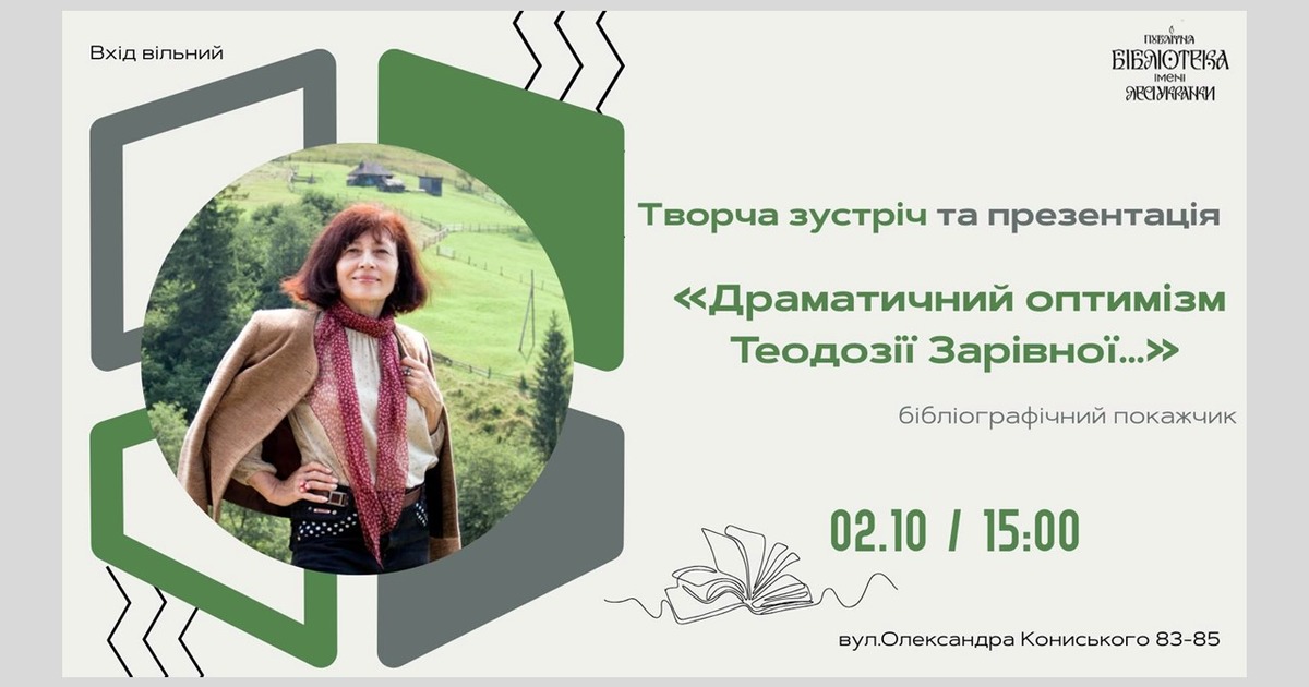 2 жовтня о 15:00 у Публічній бібліотеці імені Лесі Українки відбудеться презентація бібліографічного покажчика “Драматичний оптимізм Теодозії Зарівної…”.