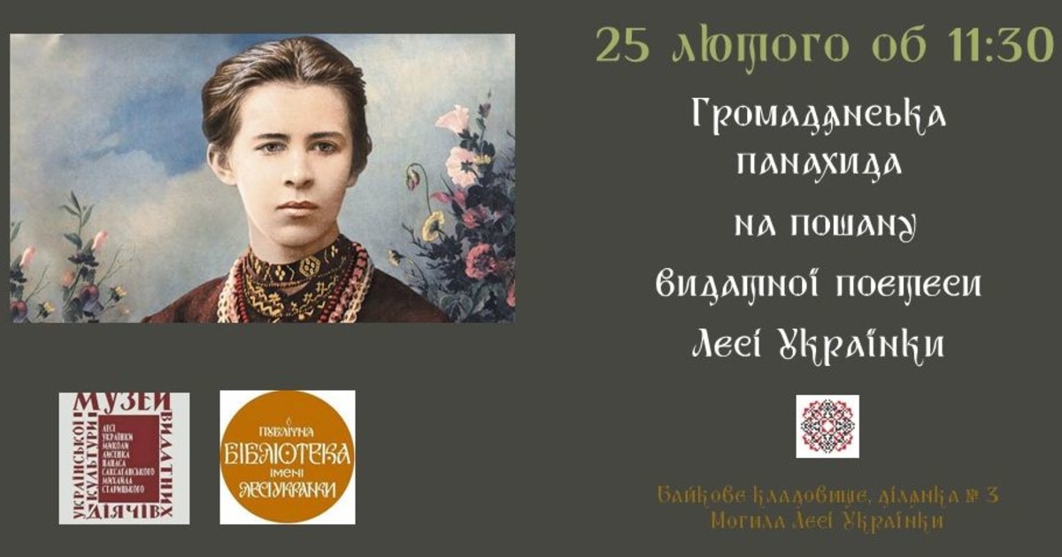 Публічна бібліотека імені Лесі Українки спільно із Музеєм видатних діячів української культури запрошує приєднатися 25 лютого до громадської панахиди біля могили Лесі Українки на Байковому кладовищі.
