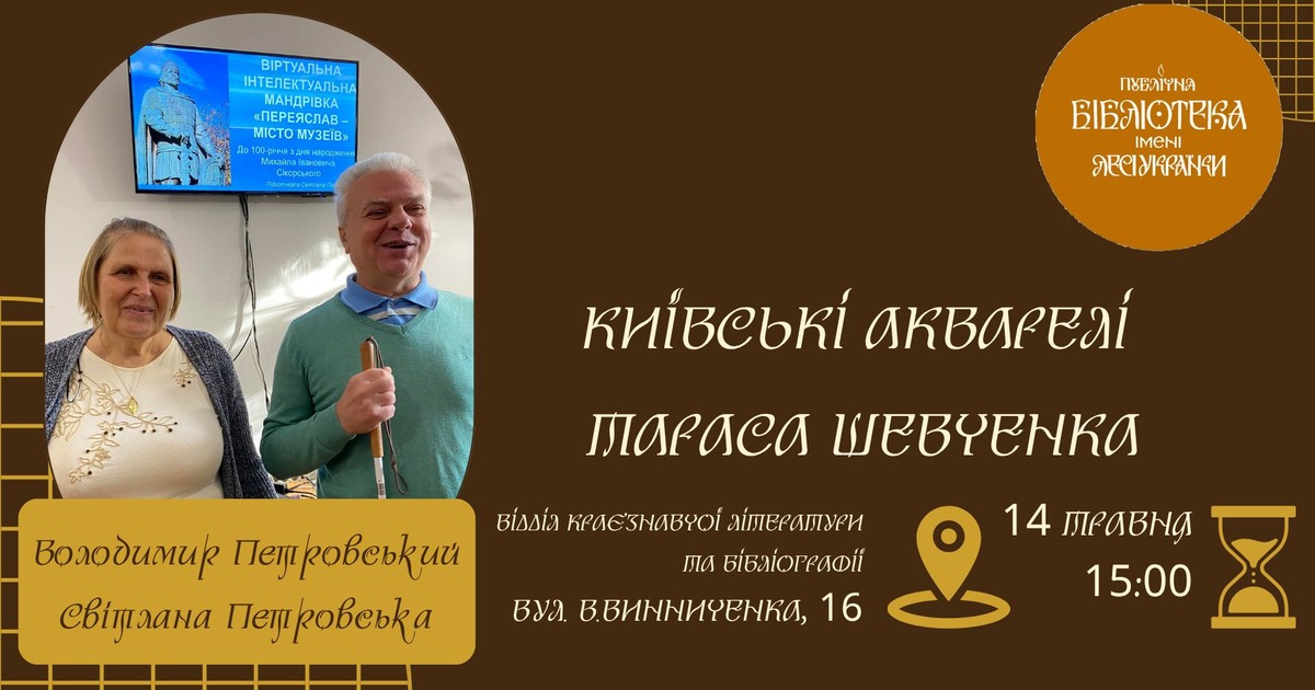 Запрошуємо на актуальну києвознавчу лекцію друзів бібліотеки, туристів, краєзнавців, істориків, правозахисників, очільників ГО ВГО “Всеукраїнський парламент працездатних інвалідів” Володимира Петровського та Світлани Петровської – “Київські акварелі Тараса Шевченка”.