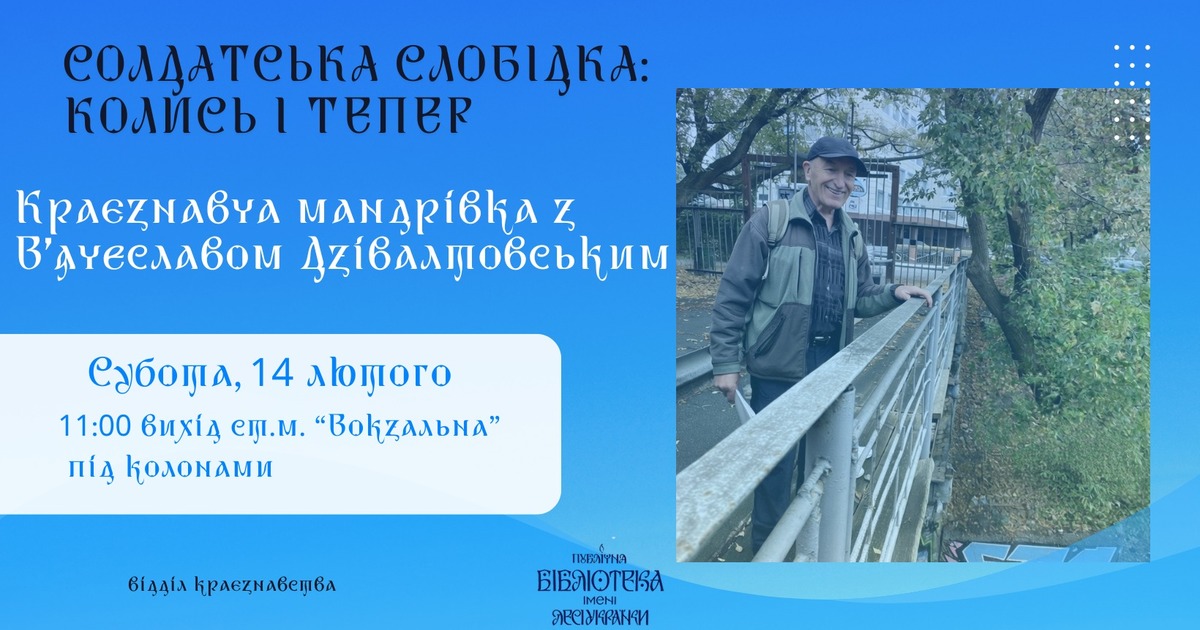 У суботу, 14 лютого відбудеться краєзнавча мандрівка з Вʼячеславом Дзівалтовським “Солдатська слобідка: колись і тепер”. Маршрут: Галицька площа — вул. Дмитрівська — вул. Павлівська — вул. Винниченка, 16, відділ краєзнавства Публічної бібліотеки імені Лесі Українки.