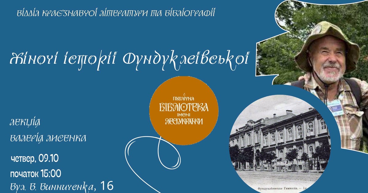 Запрошуємо на києвознавчу лекцію Валерія Лисенка “Жіночі історії Фундуклеївської” в четвер, 9 жовтня, о 15 годині у відділі краєзнавчої літератури та бібліографії (Вул. Володимира Винниченка, 16).