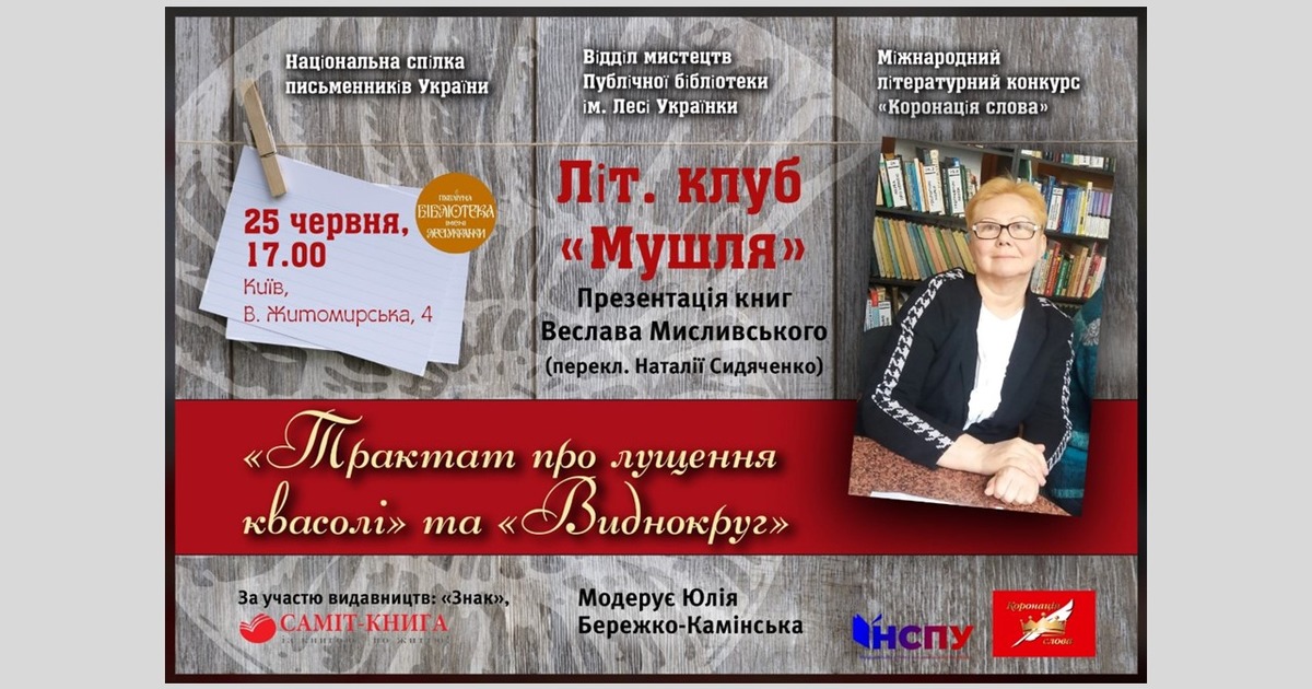 25 червня о 17.00 у межах нового проєкту Національної спілки письменників України, Публічної бібліотеки ім. Лесі Українки та за підтримки Міжнародного літературного конкурсу «Коронація слова», «Літ. клуб “Мушля”» будуть представлені книги польського письменника Веслава Мисливського «Трактат про лущення квасолі» та «Виднокруг» у перекладі Наталії Сидяченко (видавництво «Саміт-Книга»). Захід відбудеться у відділі літератури з питань мистецтв Публічної бібліотеки ім. Лесі Українки (вул. В. Житомирська, 4).
