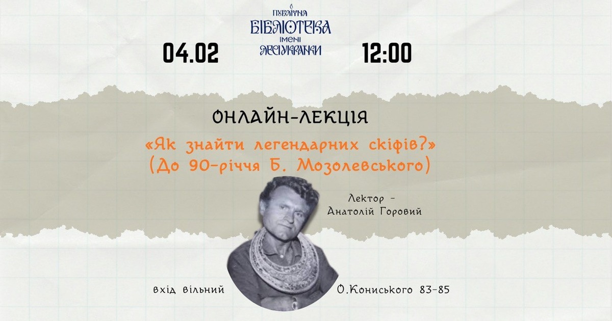 4 лютого о 12:00 у Публічній бібліотеці імені Лесі Українки відбудеться онлайн-лекція «Як знайти легендарних скіфів» до 90-річчя Бориса Мозолевського.