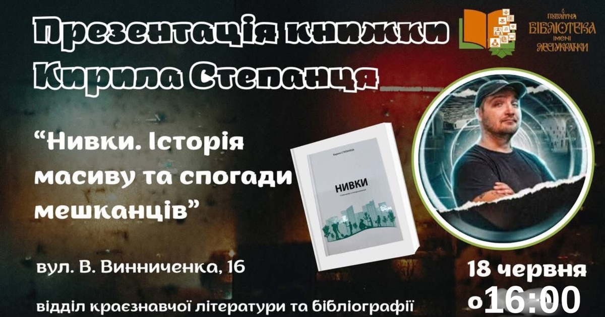Публічна бібліотека імені Лесі Українки запрошує на зустріч із краєзнавцем і києвознавцем, дигером, сталкером і письменником Кирилом Степанцем. Під час події відбудеться презентація книжки «Нивки. Історія масиву та спогади мешканців» — унікального видання, що поєднує краєзнавче дослідження та живу пам’ять місцевих жителів.