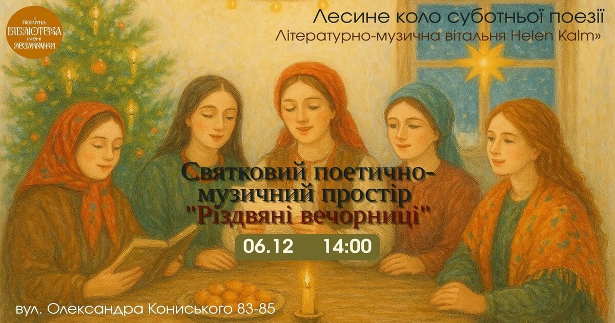 Коли грудень запалює віконні вогники, час збиратися там, де звучать вірші, народжується натхнення й зустрічаються однодумці. Саме такими віршами наповниться наша зустріч у межах проєкту “Лесине коло суботньої поезії” та Літературно-музичної вітальні Helen Kalm.