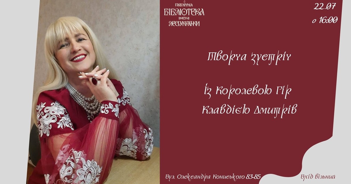 22 липня о 16:00 у Публічній бібліотеці імені Лесі Українки відбудеться творча зустріч із Королевою Гір Клавдією Дмитрів.