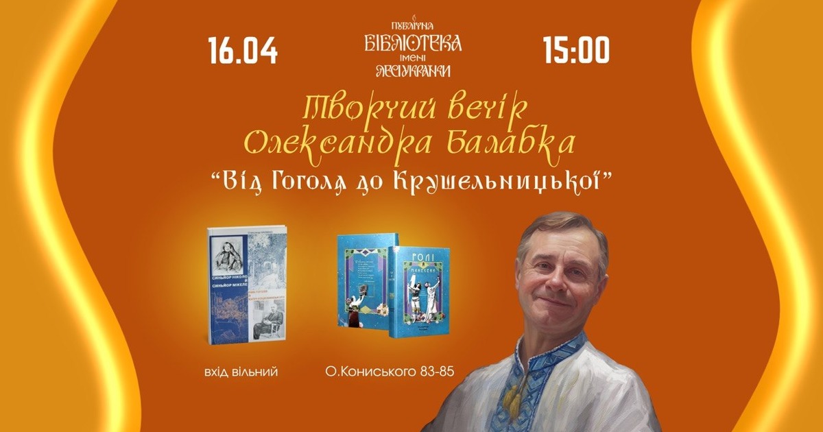 16 квітня о 15:00 у Публічній бібліотеці імені Лесі Українки відбудеться творчий вечір Олександра Балабка.