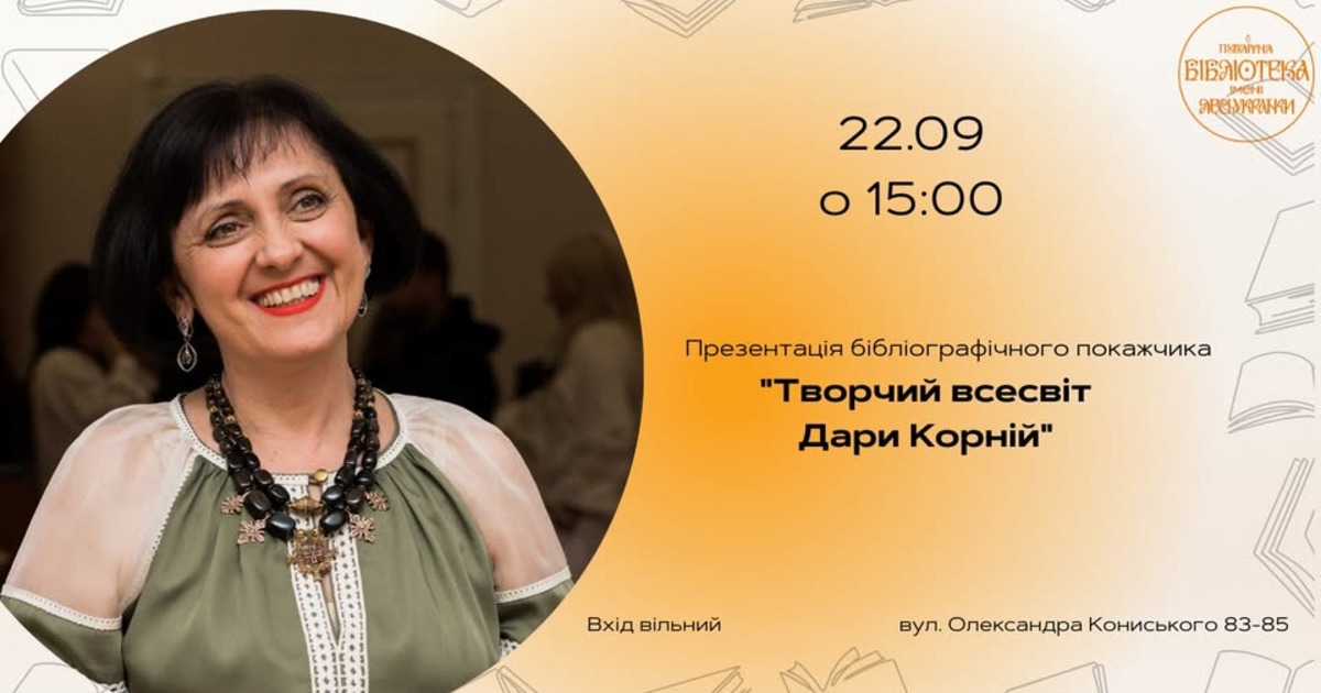 22 вересня о 15:00 у Публічній бібліотеці імені Лесі Українки відбудеться презентація бібліографічного покажчика “Творчий всесвіт Дари Корній”.