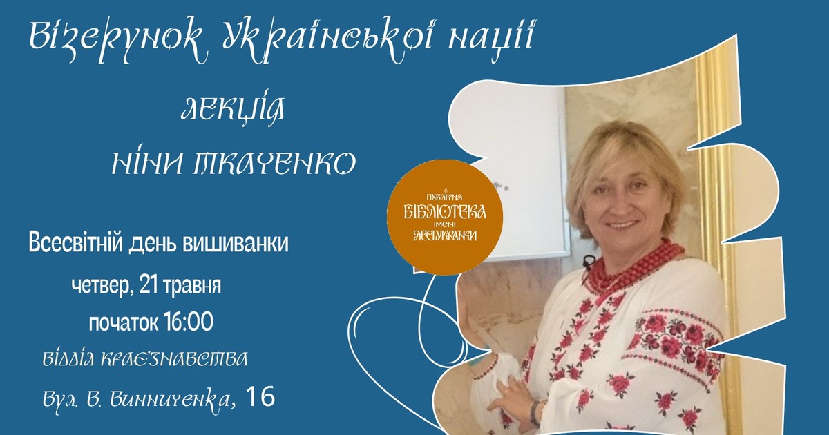 У Всесвітній день вишиванки запрошуємо на лекцію «Візерунок Української нації. Вражаємо світ красою і розмаїттям українських вишиванок!». Лекцію прочитає Ткаченко Ніна, гід-перекладач чеської, словацької, польської та англійської мов, екскурсовод, членкиня Гільдії професійних екскурсоводів та гідів-перекладачів.