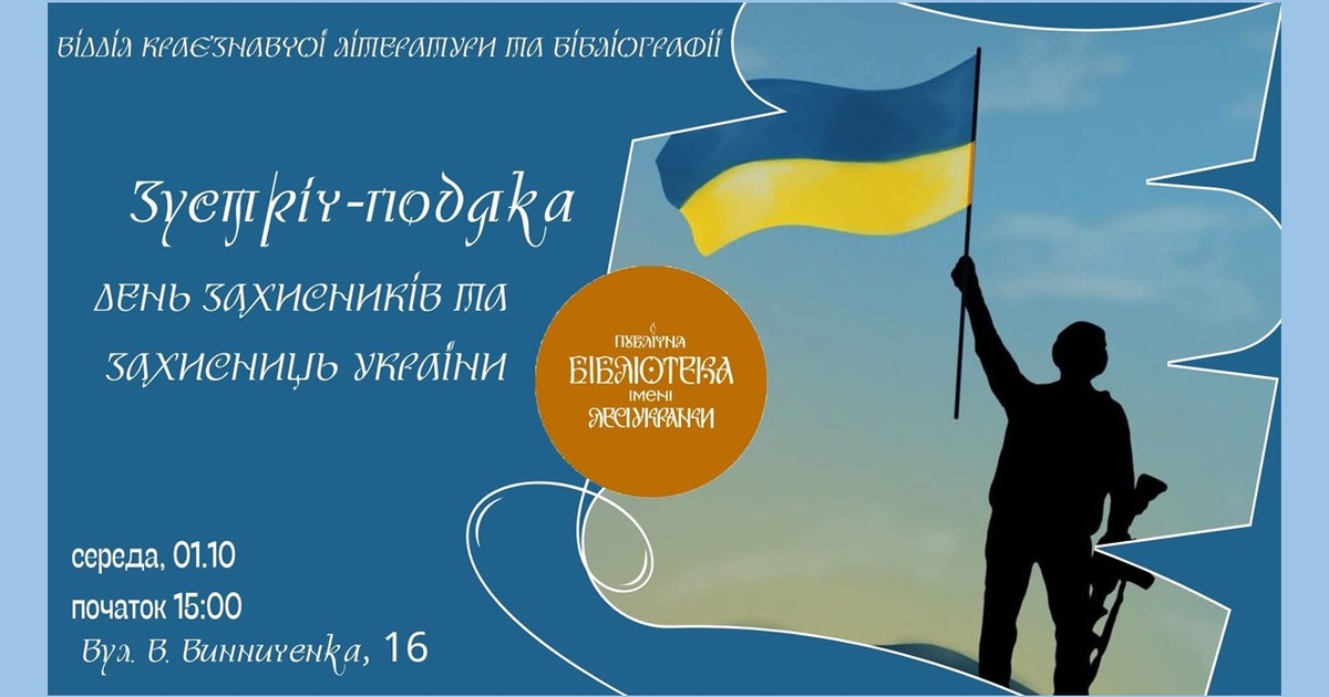 Запрошуємо долучитися до Зустрічі-подяки нашим Захисникам та Захисницям 1 жовтня о 15:00 у відділі краєзнавчої літератури та бібліографії за адресою: вул. Володимира Винниченка, 16.