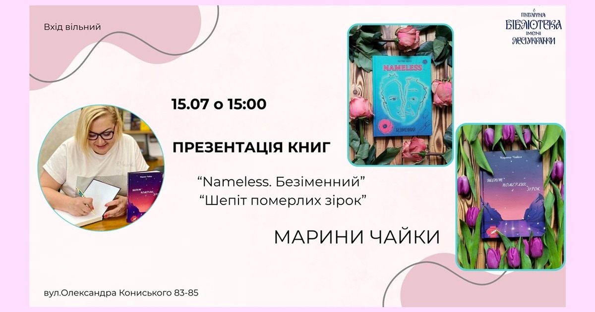 вул. Олександра Кониського, 83-85, Київ вул. Олександра Кониського, 83-85,Київ15 липня о 15:00 у Публічній бібліотеці імені Лесі Українки відбудеться презентація книг «Nameless. Безіменний» та «Шепіт померлих зірок» Марини