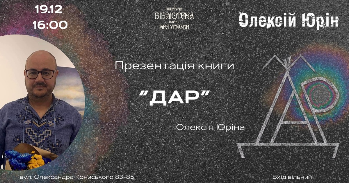 19 грудня о 16:00 у Публічній бібліотеці імені Лесі Українки відбудеться презентація поетичної збірки “Дар” Олексія Юріна. Олексій Юрін - |