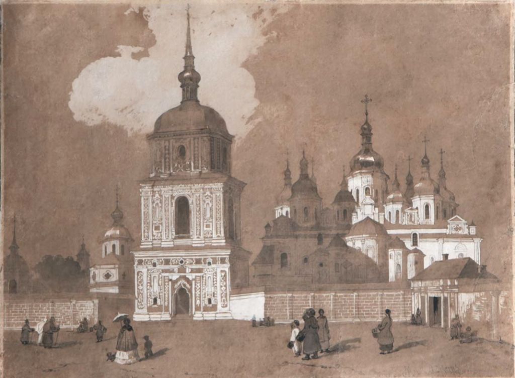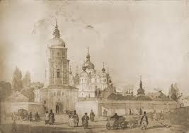існування собор та архітектурний комплекс навколо нього неодноразово зазнавали конструктивних змін. Пожежа 1697 р. знищила всі дерев’яні будівлі Софійського монастиря. Наприкінці XVII ст. почалося будівництво нових мурованих споруд, яке тривало 69 років. Було зведено будинок митрополита, трапезну, бурсу, Братський корпус, західну в’їзну браму (браму Заворовського), південну в’їзну вежу, монастирський мур. Усі споруди виконано у стилі українського бароко. Дзвіницю (на передньому плані) збудовано протягом 1699-1706 рр. У 1747 -1748 рр. під керівництвом архітектора Й. Шеделя її перебудували, замінивши два верхні яруси, пошкоджені землетрусом. Ліпний декор стін виконали українські майстри Іван та Степан Стобенські. У 1807 р. від удару блискавки згоріла баня дзвіниці з високим позолоченим шпилем. Її відбудовано 1812 р. в нових архітектурних формах. Причетність Т. Шевченка до виконання цього твору засвідчують окреми елементи зображення: своєрідні купчасті хмари, на тлі яких подано баню і шпиль дзвіниці (цей композиційний прийом використано також в офорті «Видубицький монастир»); характерна світлотіньова проробка архітектурних