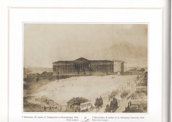 ім. Т. Г. Шевченка. Тут неодноразово бував Т. Шевченко у зв’язку з роботою в Археографічній комісії. Серед тих, хто ініціював створення Тимчасової комісії для розгляду стародавніх актів, - перший ректор університету св. Володимира Михайло Максимович, близький Шевченків приятель і однодумець. З університетом пов’язана й діяльність Кирило-Мефодіївського братства. Панорамне зображення будинку Київського університету виконано з боку Бессарабської площі. Судячи з фотографій другої половини ХІХ ст., саме цей ракурс був найзручнішим для огляду фасаду будівлі університету. Монументальна і дещо похмура споруда у стилі класицизму тріумфально панує над нерегулярною і нещільною, переважно одноповерховою на той час, забудовою околиці Києва. Сучасник Шевченка О. Романович-Славатинський так згадує Київ 1840-х: «На моїх очах засаджувався Бібіковський бульвар тополями й осокорами, що вже