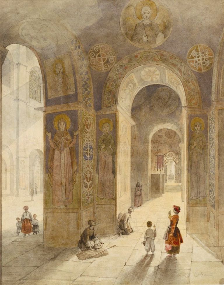 три роки. Сучасник писав, що «під залізними скребками… базарних художників зникли дороцінні зображення». Така недосконала техніка ледве не призвела до загибелі живопису» («Крізь віки…», С. 289). Таким чином, Т. Шевченко бачив щойно відкриті стародавні фрески, які на той час поновлялися темперними фарбами. Це могло вплинути на вибір ракурсу зображення, адже фрески в акварелі прописано ретельніше за нечисленні людські постаті. В альбомі Т. Шевченка 1846-1850 рр. є олівцевий начерк внутрішнього вигляду собору св. Софії у Києві, датований 1846 р. Привертає увагу його подібність до коментованої акварелі за композиційною побудовою. Питання авторства цього твору, який традиційно приписували М. Сажину, розкрито у статті В. Яцюка