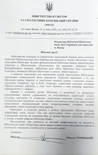 У ювілейні для бібліотеки дні особливо приємно отримати вітання і високу оцінку діяльності колективу від Міністра Міністерства культури та стратегічних комунікацій України Миколи Точицького.