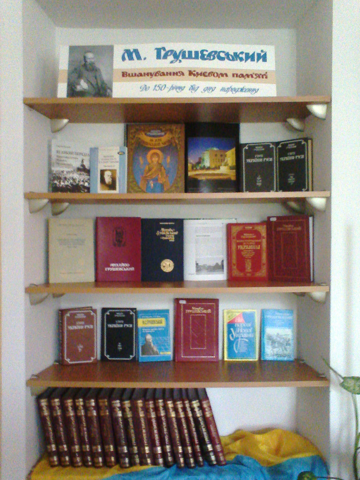 До цієї дати відділ краєзнавчої літератури та бібліографії відкрив книжкову виставку “Михайло Грушевський – вшанування Києвом  пам’яті. До 150-річчя від дня народження”. На виставці представлені видання  різних років, тому користувачі  можуть ознайомитися з науковою спадщиною та різноплановими виданнями про життя і наукову діяльність Михайла Сергійовича, його епістолярною спадщиною.