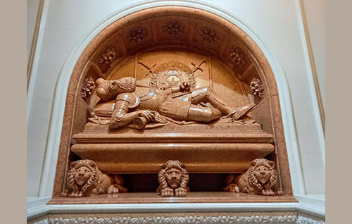 Пам’ятник був зруйнований у 1941-му. До Дня Незалежності спільними зусиллями обох держав за дорученням президентів Володимира Зеленського та Гітанаса Науседи монумент був відновлений. Надгробок повернули на те історичне місце, де він знаходився з самого початку. Наступний етап — складні реставраційні роботи декорацій самої зали.