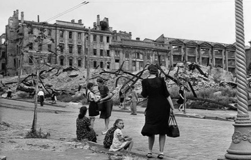 Руїни забудови Музичного провулку, посередині-будівля ломбарду. Фото з відкриих джерел