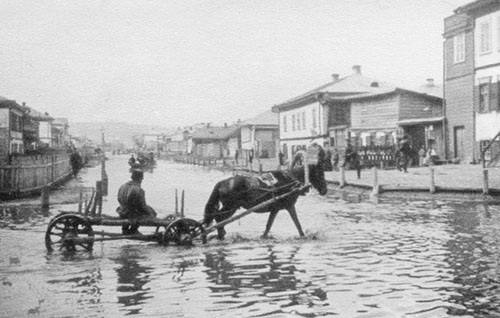 У 1907 році на Подолі та в плоскій частині у воді опинилася велика кількість будинків та церков. Мешканці ж прибережних слобідок взагалі змушені були покинути свої домівки й перебратися в місто. Припинив роботу трамвай, а придатним видом транспорту на час високої води для жителів Подолу стали човни», — розповідалося на шпальтах тогочасної преси.