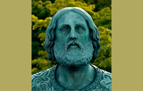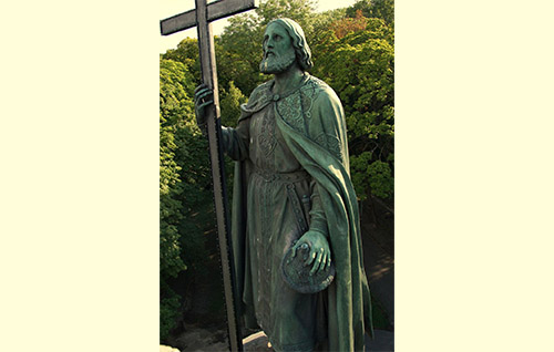 В уявленні знаменитого скульптора правитель постав з хрестом у руці, спрямовуючи погляд у вічність — над Дніпровими кручами.