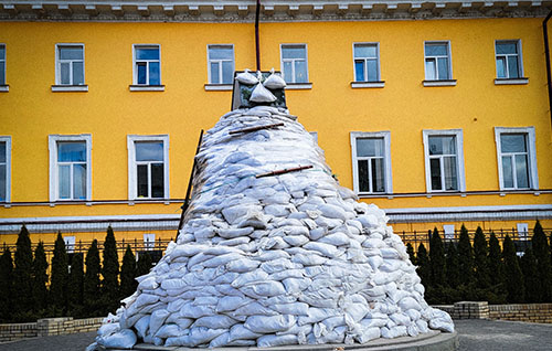 На Подолі волонтери, серед яких і альпіністи, зміцнили кінну скульптуру гетьмана Петра Сагайдачного. Цей монумент відносно молодий, але вже став однією з візитних карток Контрактової площі. Памʼятник Сагайдачному обклали мішками з піском, як і багато інших у Києві.