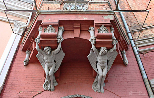 Цікавою особливістю будівлі є також те, що її парадний вхід облаштований не просто з вулиці, а через браму, франковану постатями крилатих демонів, що тримають еркер.