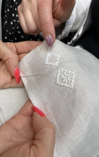 Роздивлялись тканину, яка максимально подібна до полотна автентичних сорочок. Споглядали при денному світлі, як відтінки білих ниток підсвічують або охолоджують колір полотна. Ось такі нюанси і складають майстерність, яка напрацьовується роками вишивальної практики і вивчення тисяч давніх сорочок, щоб прийти до розуміння, як її відтворити в сучасних матеріалах.